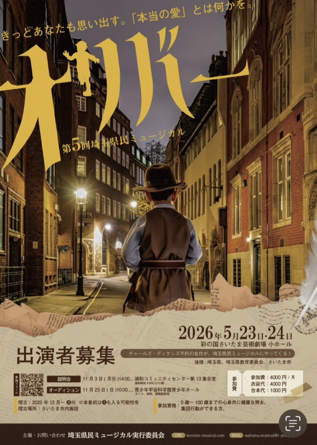 2026年5月23日(土).24日(日) 彩の国さいたま芸術劇場小ホールチャールズ・ディケンズ不朽の名作『オリバー・ツイスト』原作ミュージカル「オリバー!」で一緒に舞台に出ませんか?「本当の愛」とは何かを問う、感動物語です。0歳から100歳までの健康な方を幅広く募集します。経験は問いません。 熱意のある方募集しています!